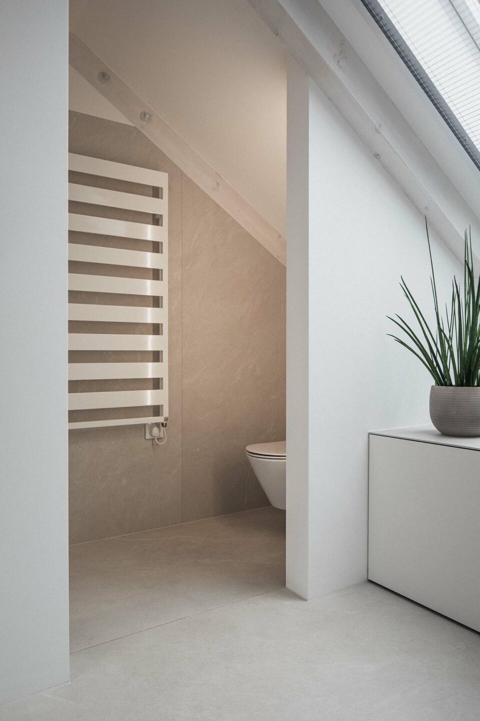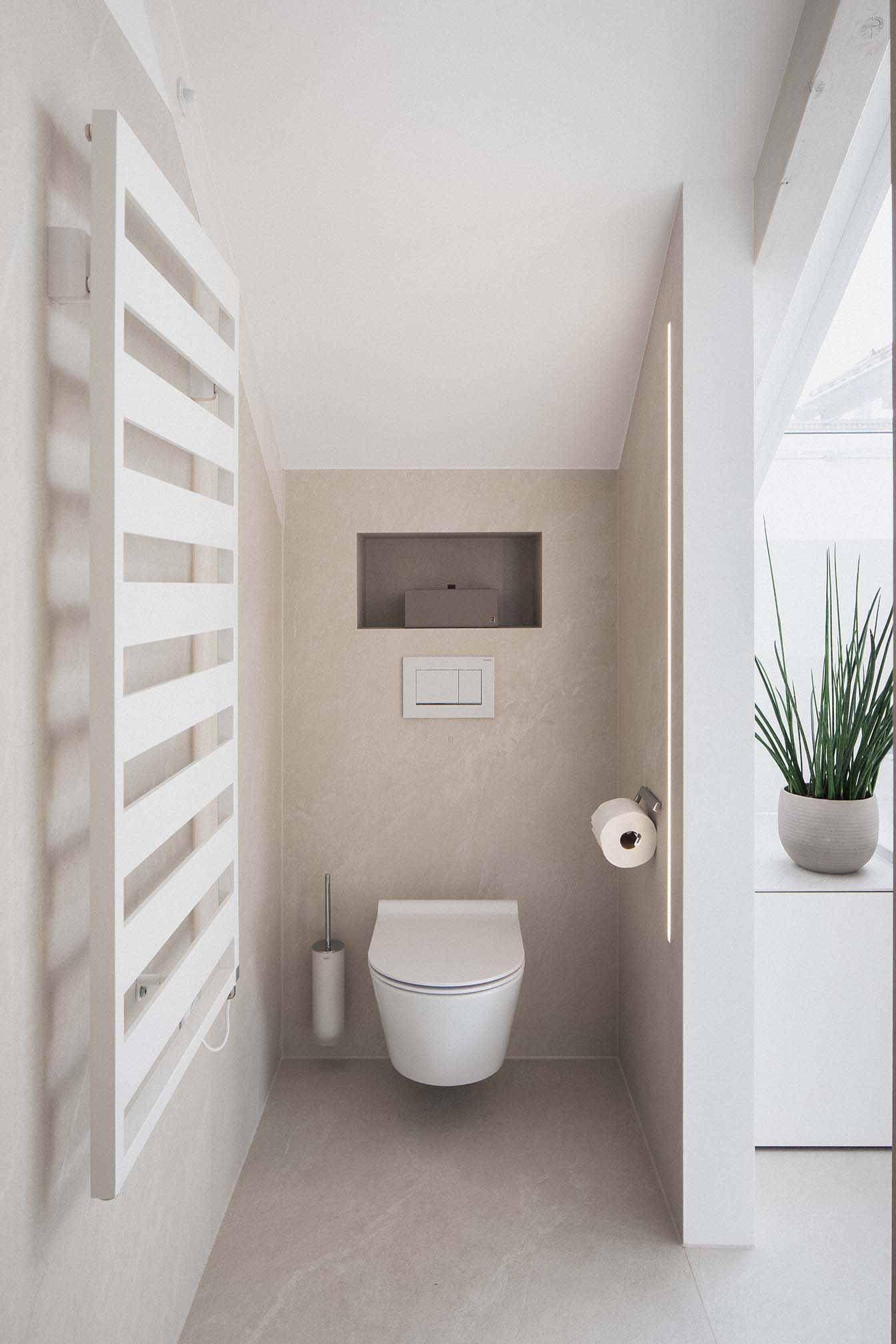 A világos színek frissességet és könnyedséget hoznak ebbe a vorarlbergi fürdőszobába. A különböző kerámiaszínek összjátéka a fal- és padlófelületeken a világos bútorokkal kombinálva élénkítő hangulatot teremt.